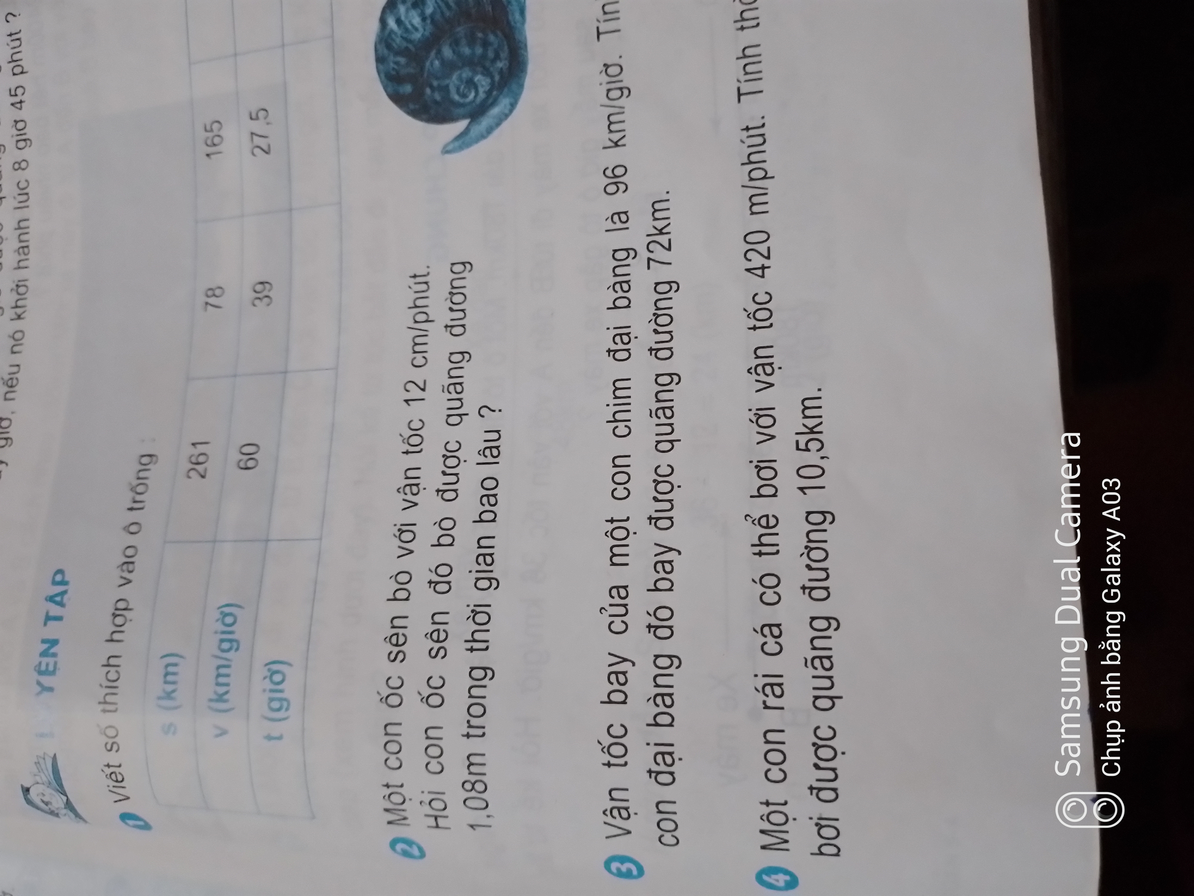 . Hỏi con ốc sên đó bò được quãng đường 1,08m trong thời gian bao lâu?
