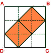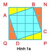 Lần lượt trên các cạnh QM, MN, NP và PQ, đánh dấu vào các điểm A, B, C, D sao cho MA=NB=PC=DQ=1/4 mỗi cạnh. Sau đó cắt theo các đường AB, BC, CD, DA. Ta được hình vuông ABCD có diện tích 10 ô vuông nhỏ (phần mầu xanh- Hình 1a)
