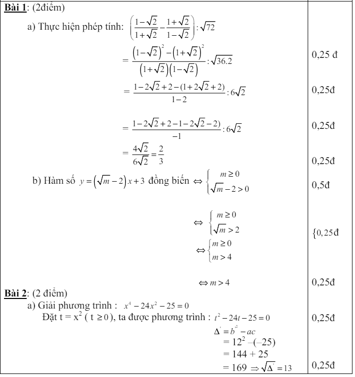 Đáp án đề ôn thi vào 10 môn Toán số 1