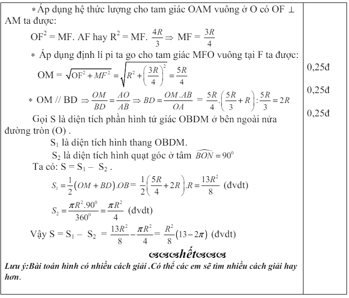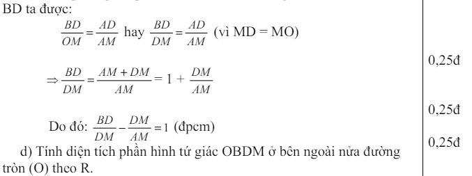 d) Tính diện tích phần hình tứ giác OBDM ở bên ngoài nửa đường tròn (O) theo R.