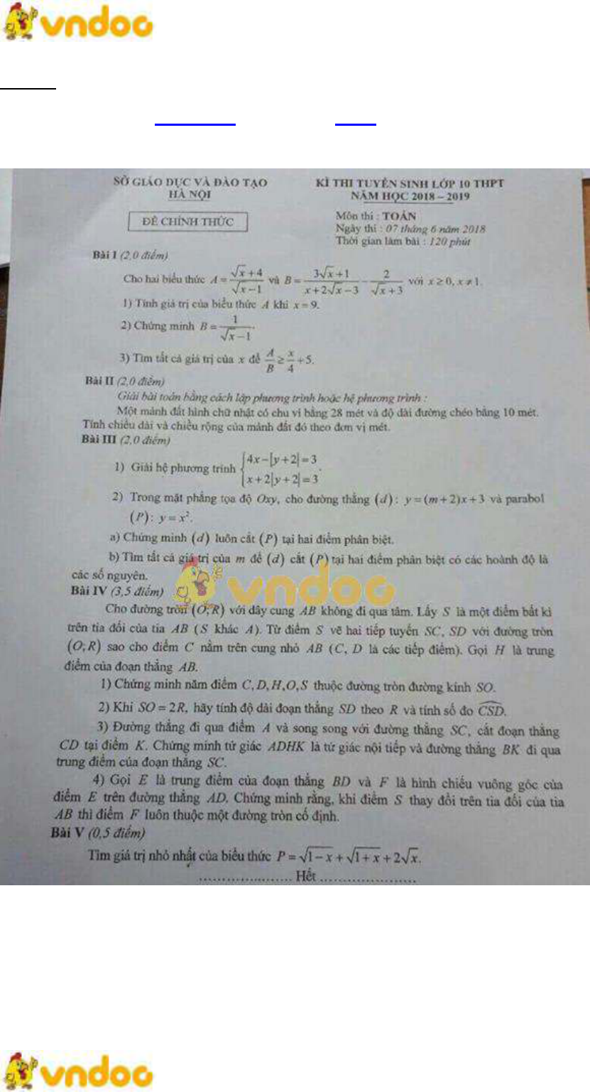 Đề thi tuyển sinh vào lớp 10 môn Toán năm học 2018 - 2019