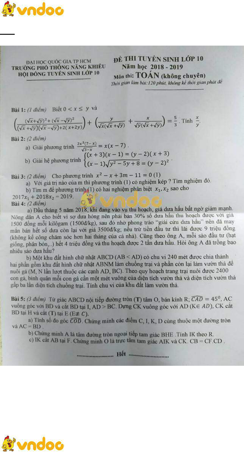 Đề thi tuyển sinh vào lớp 10 THPT môn Toán Sở GD&ĐT Thành Phố Hồ Chí Minh năm học 2018 - 2019