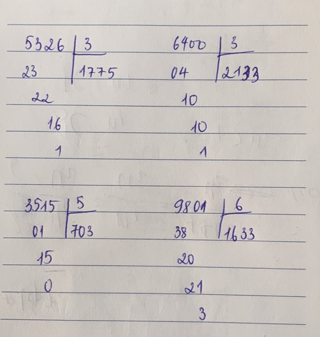 Thực hiện phép chia 5326 : 3 , 6400 : 3, 3515:5, 9801:6