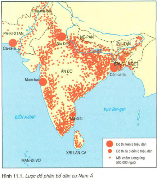 Căn cứ vào hình 11.1, em có nhận xét gì về đặc điểm phân bố dân cư của Nam Á