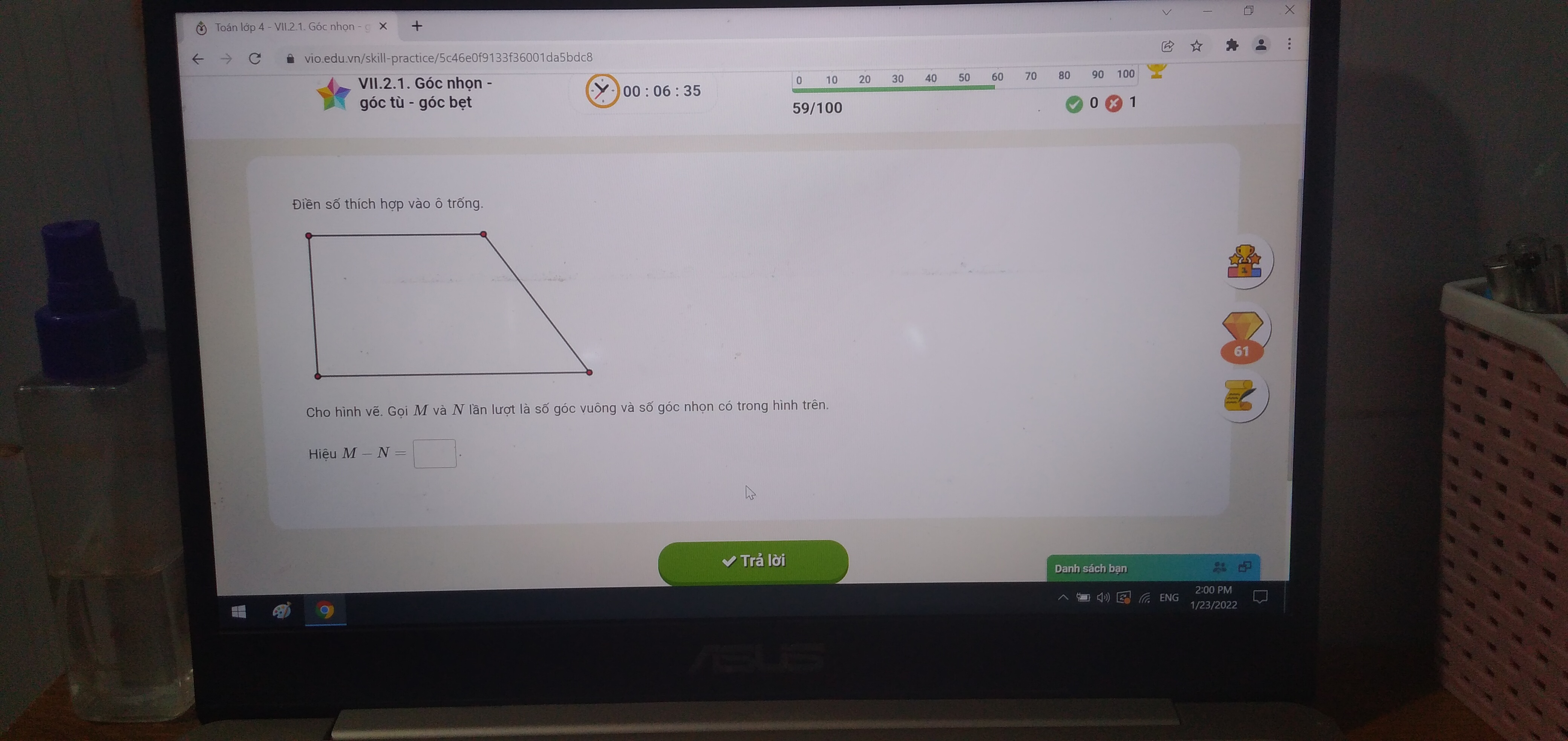 . Gọi M và N lần lượt là số góc vuông và số góc nhọn có trong hình trên. Hiệu M-N=?