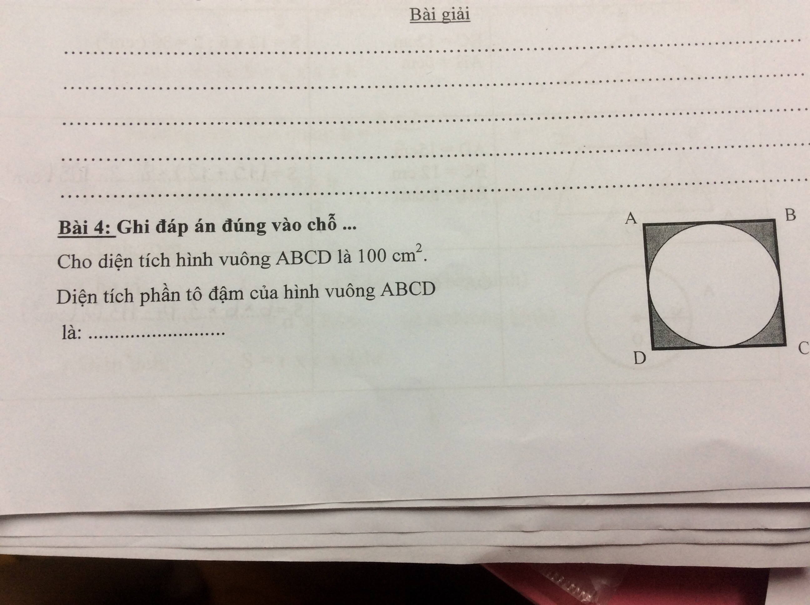 Thì đơn giản mà tính diện tích hình tròn xong lấy hình vuông abcd trừ cho diện tích hình tròn đó hoy !