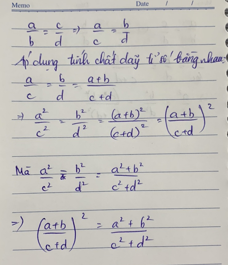 a/b = c/d chứng minh a*b/c*d = a^2 - b^2/c^2 - d^2 và (a + b/c + d)^2 = a^2 + b^2 /c^2 + d^2. Dấu * là dấu nhân, dấu ^ là mũ, / là phần, (a + b/c + d)^2 là (a + b/c + d) tất cả mũ 2