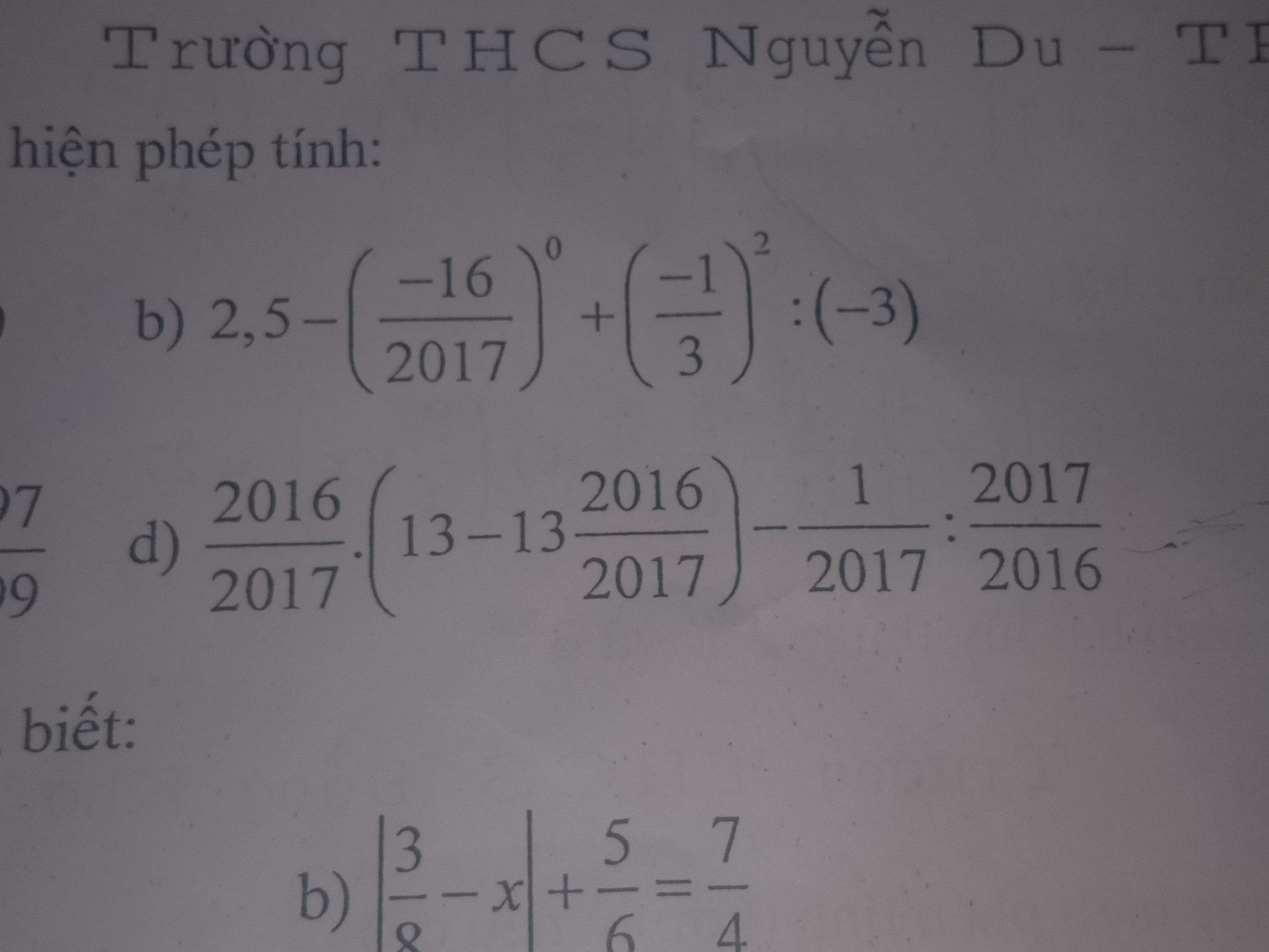 Thực hiện phép tính: 2,5 - (-16/2017)^0 + (-1/3)^2 : (-3)