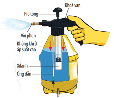 Đổ chất lỏng và đậy kín nắp bình, dùng pit-tông để bơm không khí vào bình và nén lại để tạo nên lớp không khí áp suất cao phía trên chất lỏng. - Để sử dụng, ấn vào khoá van để mở van. Không khí ở áp suất cao bên trong bình đẩy lượng chất lỏng theo ống dẫn đến vòi phun, thoát ra ngoài thành các tia hoặc các hạt sương nhỏ.