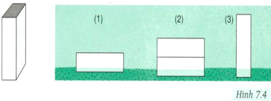 Hãy dựa vào thí nghiệm vẽ ở hình 7.4, cho biết tác dụng của áp lực phụ thuộc vào những yếu tố nào bằng cách so sánh các áp lực, diện tích bị ép và độ lún của khối kim loại xuống bột hoặc cát mịn của trường hợp (1) so với trường hợp (2) và của trường hợp (1) so với trường hợp (3).