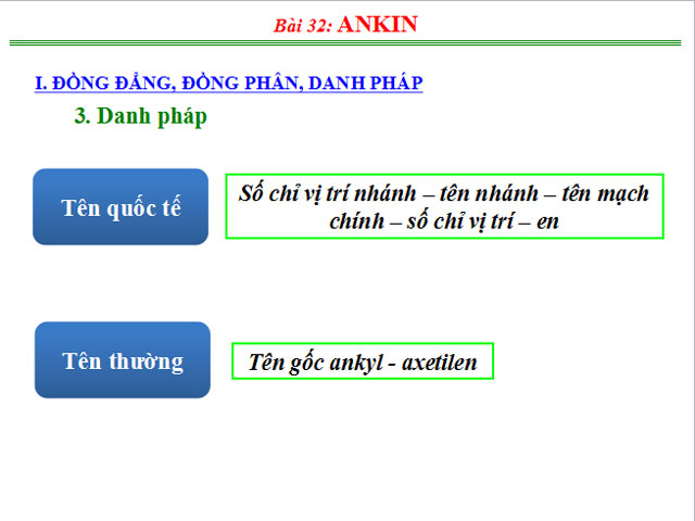 Bài giảng Hóa học 11 bài 32 mới nhất thiết kế bằng phần mềm Powerpoint chuyên nghiệp. Mời qúy thầy cô tham khảo để thêm nhiều ý tưởng hay cho việc thiết kế bài giảng điện tử sống động, trực quan phục vụ công tác giảng dạy của mình. Bài giảng còn là tài liệu hữu ích dành cho việc học tập của các em học sinh, giúp cho các em học hứng thú, dễ tiếp thu kiến thức của bài học Ankin. Các em học sinh dễ dàng nắm vững nội dung trọng tâm như: định nghĩa, công thức chung, đặc điểm cấu tạo, đồng phân, danh pháp, tính chất vật lí, tính chất hoá học của Ankin. Mời quý thầy cô và các em tham khảo.