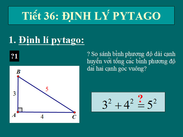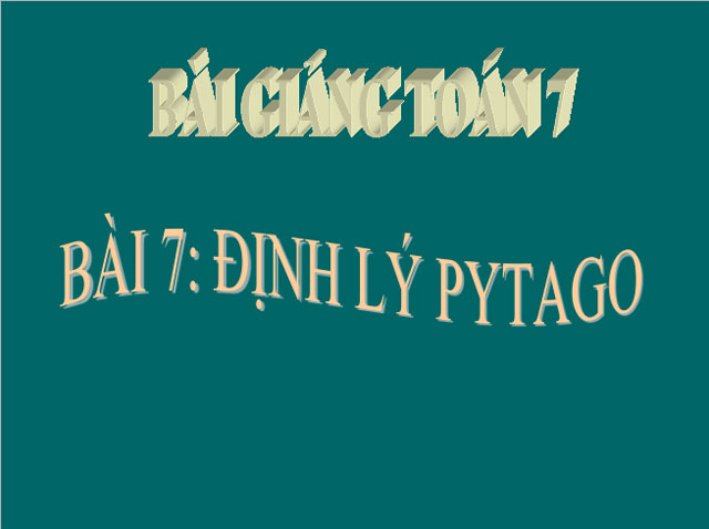Bài giảng Hình học 7 chương 2 bài 7: Định lý Pytago với nội dung cô đọng qua từng slide PowerPoint cùng hình ảnh sinh động, nội dung chính được nhấn mạnh rõ ràng giúp các em nắm được định lý Pytago về quan hệ giữa ba cạnh của một tam giác vuông và định lí Pytago đảo, biết vận dụng định lý Pytago để tính độ dài một cạnh của tam giác vuông khi biết độ dài hai cạnh kia và vận dụng định lí Pytago đảo để nhận biết một tam giác là tam giác vuông trong bài học của học sinh dễ dàng hơn.