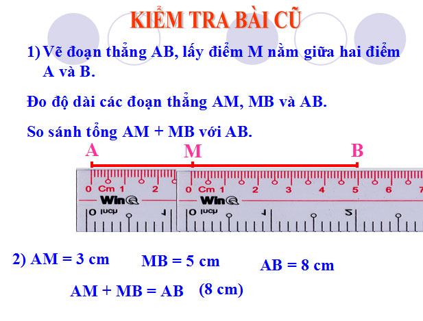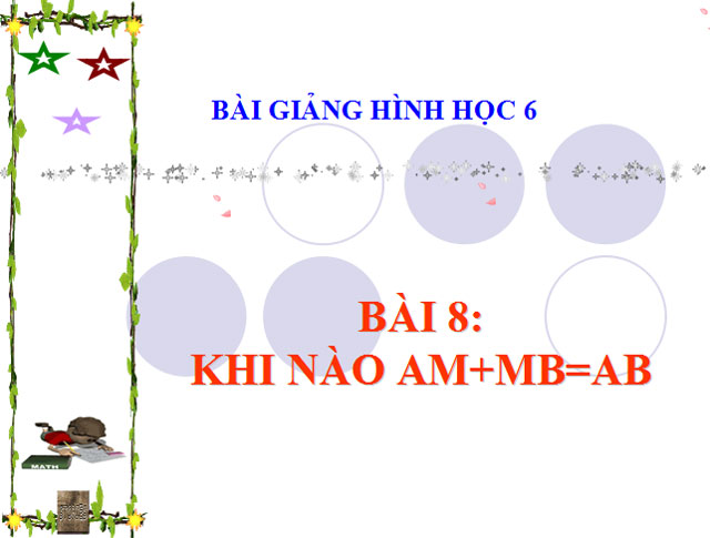 Bài giảng Hình học 6 chương 1 bài 8: Khi nào AM+MB=AB. BST được thiết kế chi tiết, rõ ràng, các em sẽ nhanh chóng biết được nếu điểm M nằm giữa hai điểm A, B thì AM + MB = AB, bước đầu tập suy luận dạng nếu a + b = c và biết 2 trong số a, b, c thì suy ra số thứ ba. Từ đó các em còn rèn kĩ năng nhận biết một điểm nằm giữa hay nằm giữa 2 điểm khác.