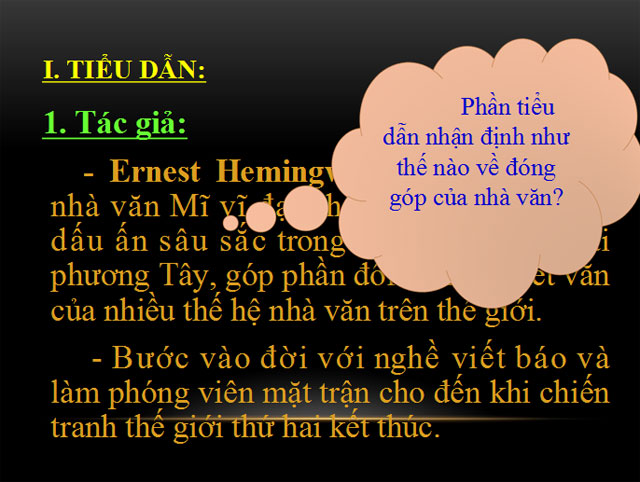 "Ông già và biển cả" là tác phẩm nổi tiếng và là một trong những đỉnh cao trong sự nghiệp sáng tác của nhà văn Ernest Hemingway. Tác phẩm đã đoạt giải Pulitzer năm 1953 và cũng góp phần quan trọng để Ernest Hemingway được nhận giải Nobel văn học năm 1954. VnDoc mời quý thầy cô tham khảo Bài giảng Ông già và biển cả để chuẩn bị một bài giảng hiệu quả và thú vị.