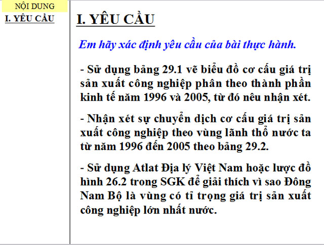Bài giảng Địa lý 12 bài 29 được thiết kế bằng phần mền trình chiếu PowerPoint mới nhất dành cho các thầy cô tham khảo. Nội dung bài Thực hành Vẽ biểu đồ, nhận xét sự chuyển dịch cơ cấu công nghiệp được truyển tải qua các slide PowerPoint, với các hiệu ứng sinh động và kèm theo hình ảnh minh họa rõ ràng giúp cho quý thầy cô có thêm ý tưởng khi thiết kế bài giảng cho mình. Ngoài ra, đây còn là tài liệu học tập hay dành cho các em học sinh. Các em dễ dàng nắm bắt được các kiến thức về sự chuyển dịch cơ cấu Công nghiệp nước ta theo thành phần kinh tế và theo lãnh thổ. Bên cạnh đó, giải thích được tại sao Đông Nam Bộ là vùng có tỉ trọng giá trị sản xuất Công nghiệp lớn nhất nước.