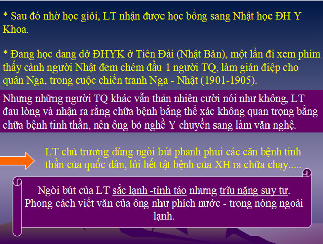 Bài giảng Ngữ văn 12 tuần 26 bài: Thuốc - Lỗ Tấn được thiết kế sinh động với hình ảnh mô tả rõ ràng, các em học sinh có thể dễ dàng nắm bắt nội dung trọng tâm của bài học: Thuốc là hồi chuông cảnh báo về sự mê muội, đớn hèn của người Trung Hoa vào cuối thế kỉ XIX và sự cấp thiết phải có phương thuốc chữa bệnh cho quốc dân, làm cho người dân giác ngộ cách mạng và cách mạng gắn bó với nhân dân. Học sinh có thể nắm được cách viết cô đọng, súc tích, giàu hình ảnh mang tính biểu tượng của Lỗ Tấn trong tác phẩm này.