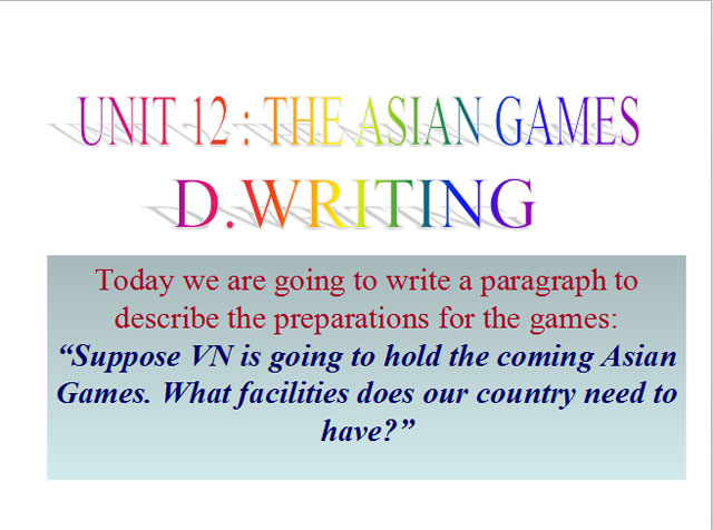 "The Asian games" là unit 12 trong chương trình Tiếng Anh 11. Bài giảng Tiếng Anh 11 unit 12 được thiết kế sinh động, khoa học là tài liệu giảng dạy Tiếng Anh 11 hữu ích giúp quý thầy cô chuẩn bị bài giảng hiệu quả, thú vị. Mời quý thầy cô và các bạn tham khảo.