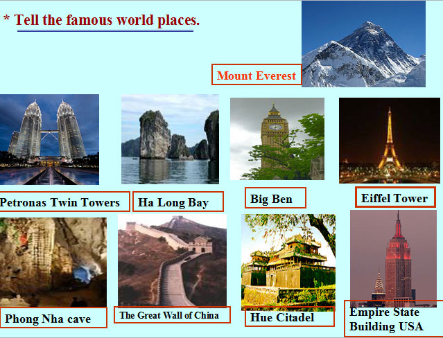 "Wonders of the World" có nội dung trọng tâm chủ đề Wonders of the world được truyền tải qua từng slide với hình ảnh minh họa rõ ràng, hiệu ứng sinh động giúp các em dễ dàng nắm bắt được những kiến thức của bài học như một số địa danh nổi tiếng thế giới, được tìm hiểu về các kỳ quan trên thế giới, học các từ liên quan đến chủ đề, phát triển các kỹ năng tiếng anh cần thiết và thực hành câu hỏi "yes/ no" để đoán về một nơi nào đó.