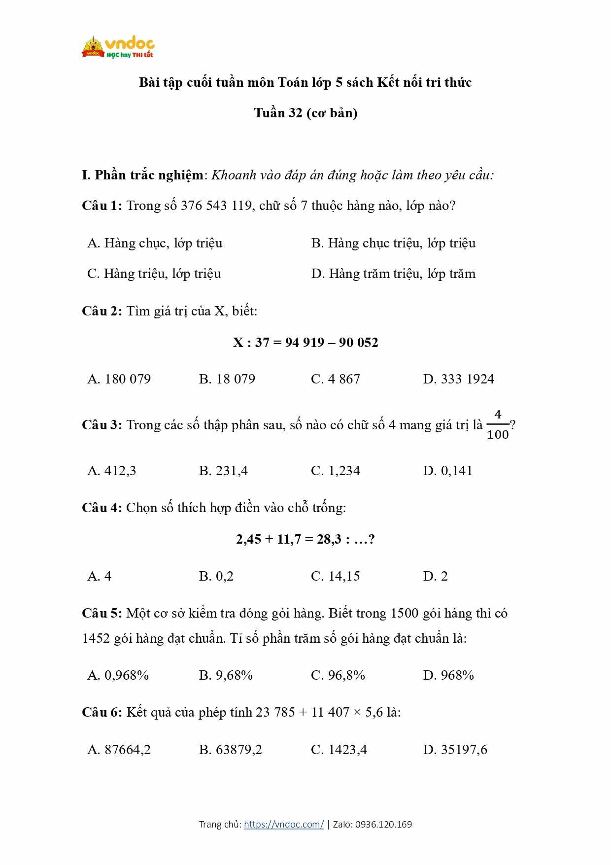 Bài tập cuối tuần môn Toán lớp 5 Kết nối tri thức - Tuần 32