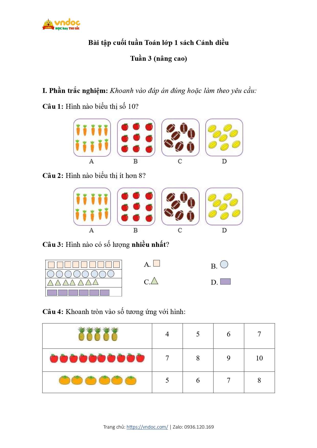 Bài tập cuối tuần Toán lớp 1 Cánh diều Tuần 3 (nâng cao) do VNDOC biên soạn gồm 2 phần trắc nghiệm và tự luận bám sát nội dung chương trình nhằm giúp các em học sinh ôn tập, tổng hợp lại kiến thức đã học ở tuần 3. Phiếu bài tập có đầy đủ các mạch kiến thức: Số tự nhiên, các phép tính, hình học,... theo chuẩn của sách Toán lớp 1 Cánh diều. Mời các em tham khảo.