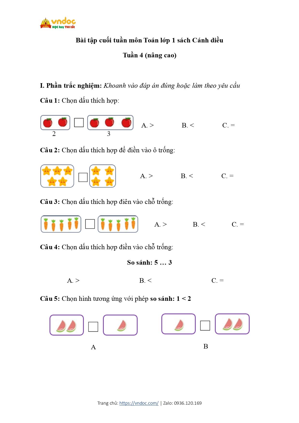 Bài tập cuối tuần Toán lớp 1 Cánh diều Tuần 4 (nâng cao) do VNDOC biên soạn gồm 2 phần trắc nghiệm và tự luận bám sát nội dung chương trình nhằm giúp các em học sinh ôn tập, tổng hợp lại kiến thức đã học ở tuần 4. Phiếu bài tập có đầy đủ các mạch kiến thức: Số tự nhiên, dấu > < =, các phép tính, hình học,... theo chuẩn của sách Toán lớp 1 Cánh diều. Mời các em tham khảo.