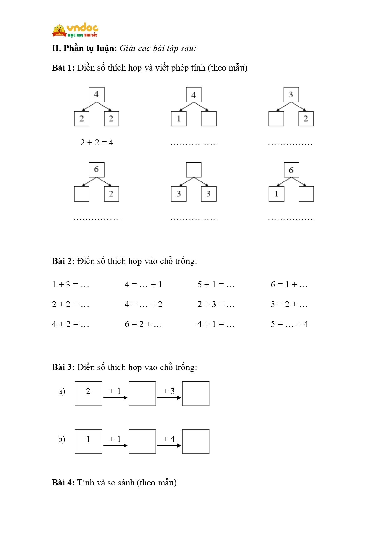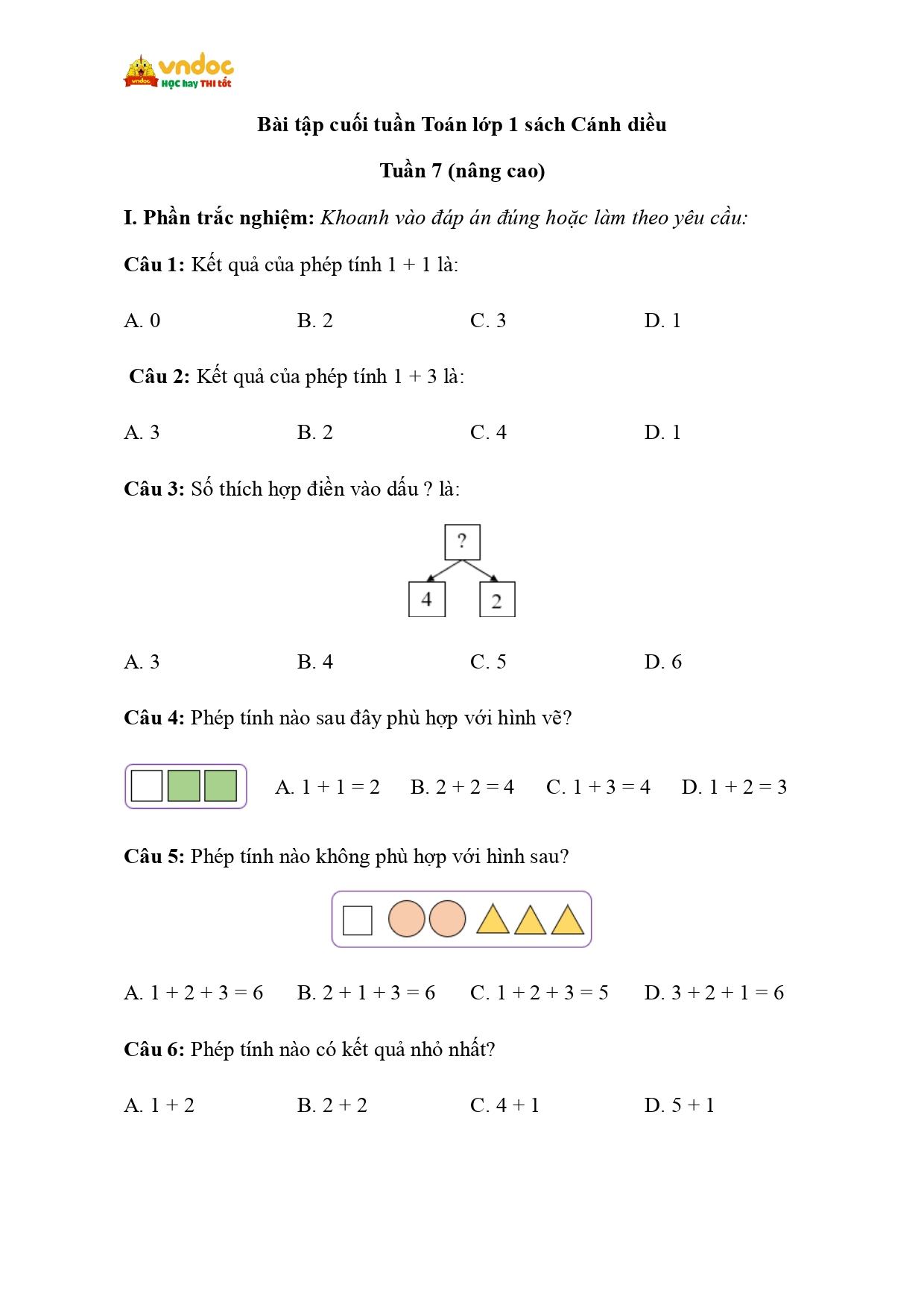 Bài tập cuối tuần Toán lớp 1 Cánh diều Tuần 7 (nâng cao) do VNDOC biên soạn gồm 2 phần trắc nghiệm và tự luận bám sát nội dung chương trình nhằm giúp các em học sinh ôn tập, tổng hợp lại kiến thức đã học ở tuần 7. Phiếu bài tập có đầy đủ các mạch kiến thức: Số tự nhiên, dấu > < =, các phép tính cộng - trừ trong phạm vi 10, hình học,... theo chuẩn của sách Toán lớp 1 Cánh diều. Mời các em tham khảo.