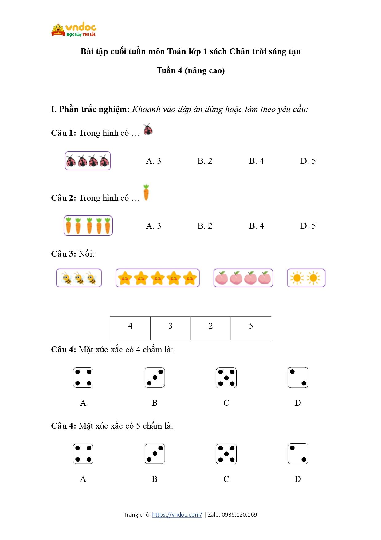 Bài tập cuối tuần Toán lớp 1 Chân trời sáng tạo Tuần 4 (nâng cao) do VNDOC biên soạn gồm 2 phần trắc nghiệm và tự luận bám sát nội dung chương trình nhằm giúp các em học sinh ôn tập, tổng hợp lại kiến thức đã học ở tuần 4. Phiếu bài tập có đầy đủ các mạch kiến thức: Số tự nhiên, các phép tính, hình học,... theo chuẩn của sách Toán lớp 1 Chân trời sáng tạo. Mời các em tham khảo.