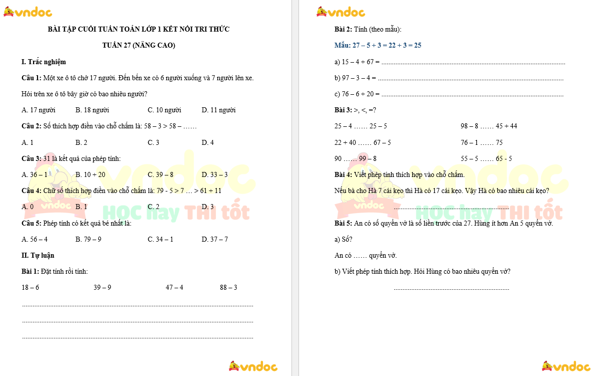 Trên đây là Bài tập cuối tuần Toán lớp 1 Kết nối tri thức Tuần 27 (nâng cao) VnDoc.com hy vọng rằng tài liệu này sẽ giúp các em luyện tập tại nhà hiệu quả. Mời thầy cô, quý phụ huynh và các em học sinh tham khảo thêm: