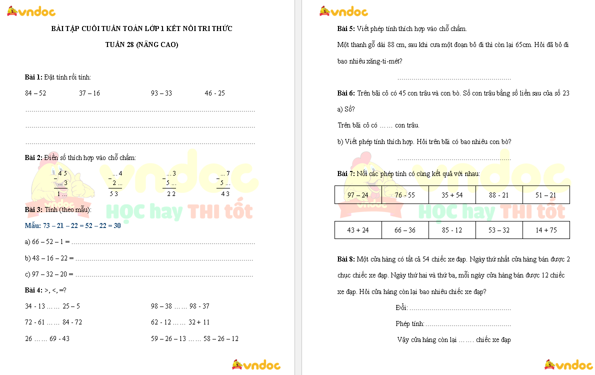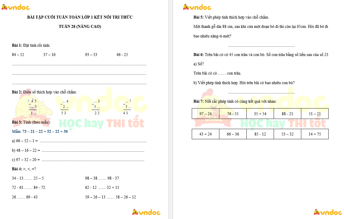 Bài tập cuối tuần Toán lớp 1 Kết nối tri thức Tuần 28 (nâng cao) do VNDOC biên soạn nhằm giúp các em học sinh ôn tập, tổng hợp lại kiến thức đã học ở tuần 28 chương trình Toán lớp 1 sách Kết nối tri thức.