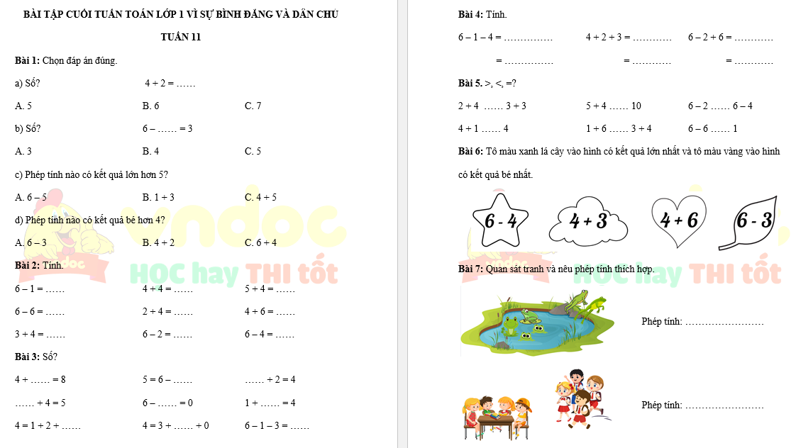 Bài tập cuối tuần Toán lớp 1 Vì sự bình đẳng và dân chủ bao gồm kiến thức về tuần 11 dành cho các em học sinh củng cố, ôn tập, rèn luyện kỹ năng giải Toán lớp 1.