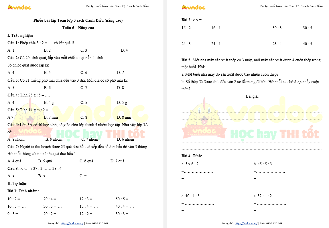 >> Tham khảo: Bài tập cuối tuần Toán lớp 3 Cánh Diều - Tuần 6 (cơ bản)