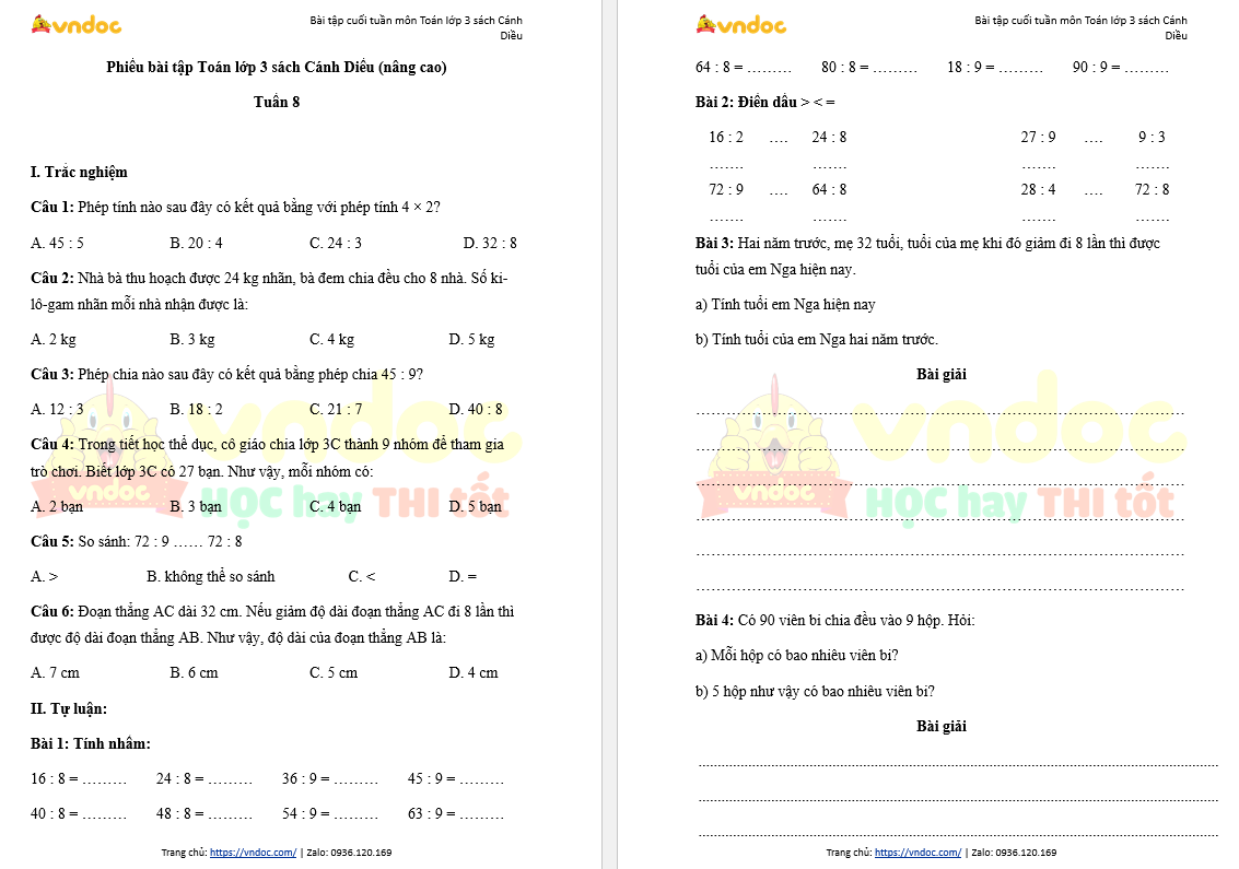>> Tiếp theo: Bài tập cuối tuần Toán lớp 3 Cánh Diều - Tuần 9 (nâng cao)