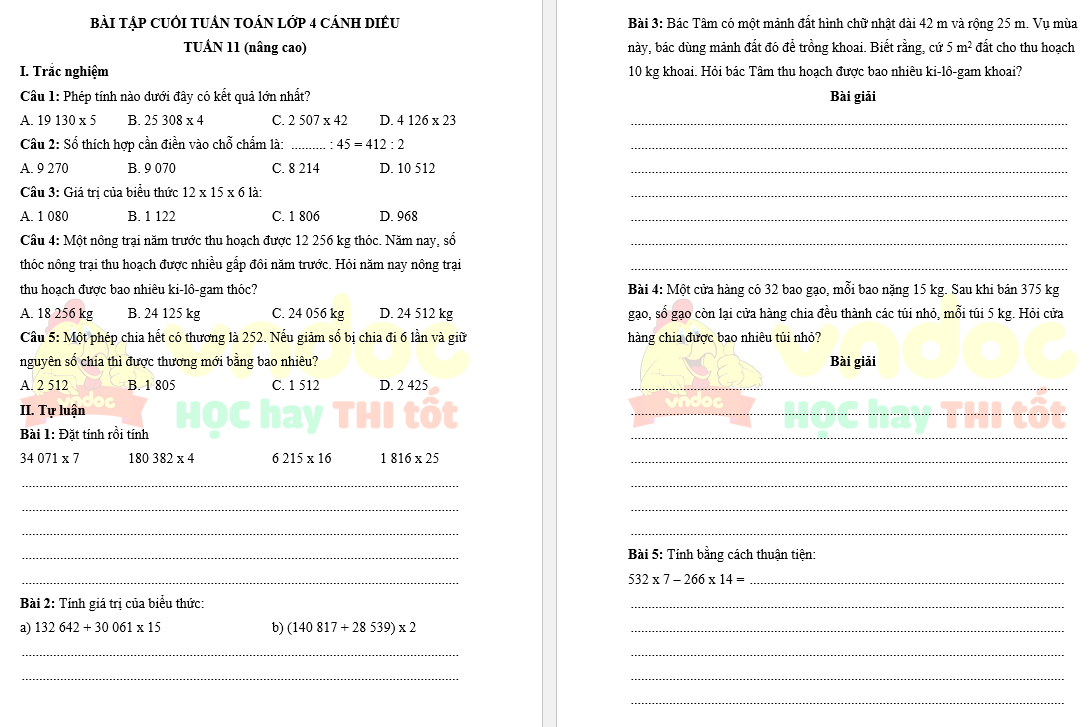 Bài tập cuối tuần Toán lớp 4 Cánh Diều - Tuần 11 (nâng cao) do VnDoc biên soạn nhằm giúp các em học sinh ôn tập, tổng hợp lại kiến thức đã học ở tuần 11 chương trình Toán lớp 4 sách Cánh Diều.
