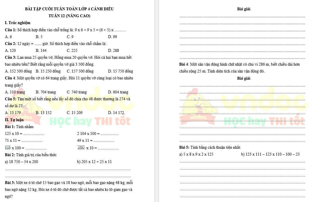 Bài tập cuối tuần Toán lớp 4 Cánh Diều - Tuần 12 (nâng cao) do VnDoc biên soạn nhằm giúp các em học sinh ôn tập, tổng hợp lại kiến thức đã học ở tuần 12 chương trình Toán lớp 4 sách Cánh Diều.