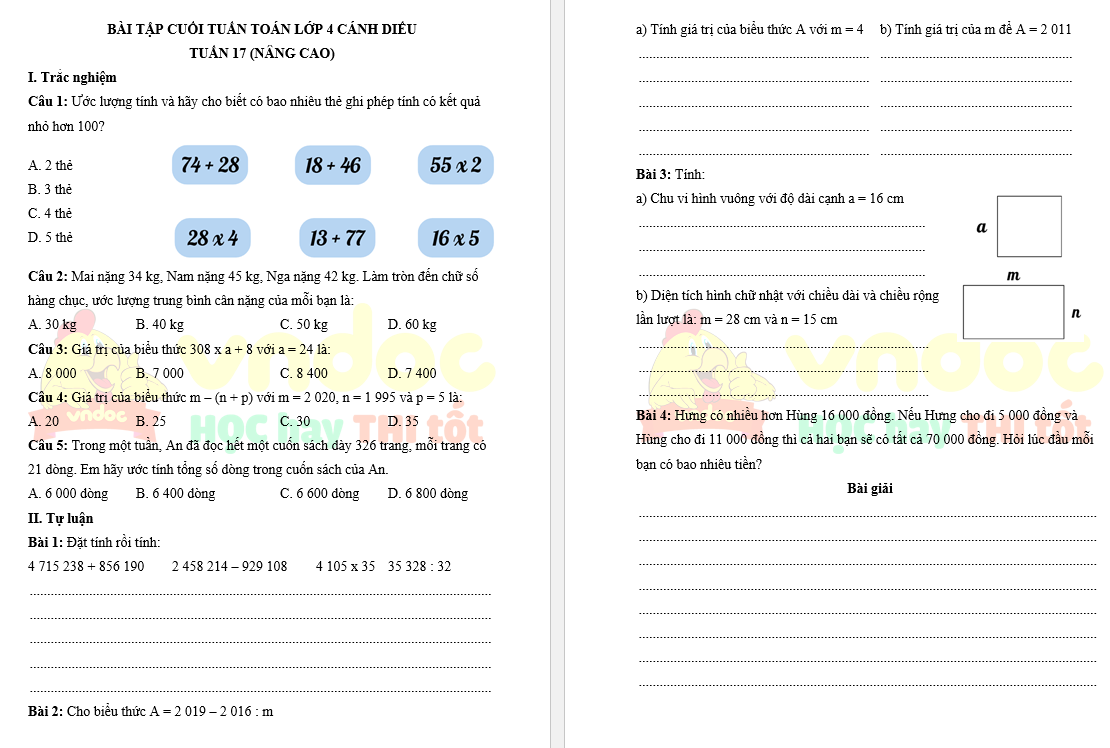 Bài tập cuối tuần Toán lớp 4 Cánh Diều - Tuần 17 (nâng cao) do VnDoc biên soạn nhằm giúp các em học sinh ôn tập, tổng hợp lại kiến thức đã học ở tuần 17 chương trình Toán lớp 4 sách Cánh Diều.