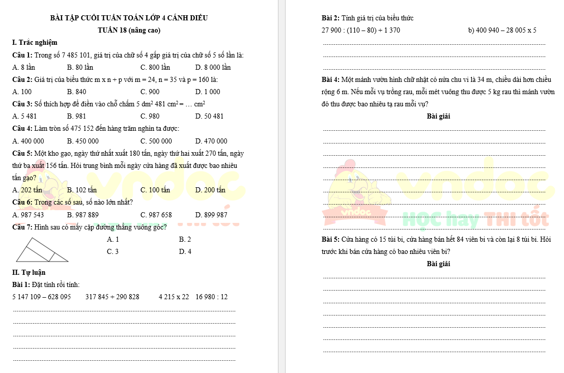 Bài tập cuối tuần Toán lớp 4 Cánh Diều - Tuần 18 (nâng cao) do VnDoc biên soạn nhằm giúp các em học sinh ôn tập, tổng hợp lại kiến thức đã học ở tuần 18 chương trình Toán lớp 4 sách Cánh Diều.