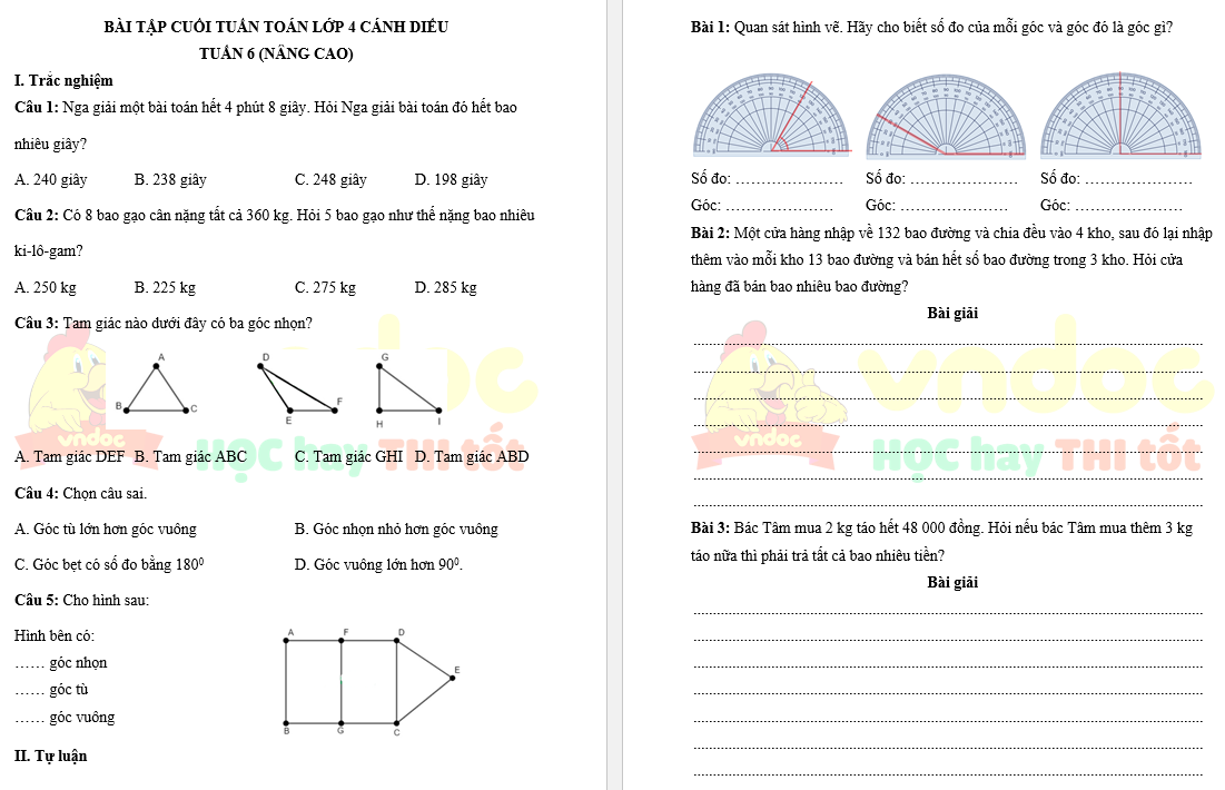Bài tập cuối tuần Toán lớp 4 Cánh Diều - Tuần 6 (nâng cao) do VnDoc biên soạn nhằm giúp các em học sinh ôn tập, tổng hợp lại kiến thức đã học ở tuần 6 chương trình Toán lớp 4 sách Cánh Diều.