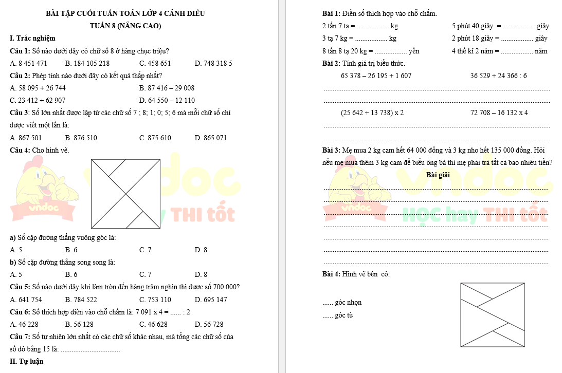 Bài tập cuối tuần Toán lớp 4 Cánh Diều - Tuần 8 (nâng cao) do VnDoc biên soạn nhằm giúp các em học sinh ôn tập, tổng hợp lại kiến thức đã học ở tuần 6 chương trình Toán lớp 4 sách Cánh Diều.