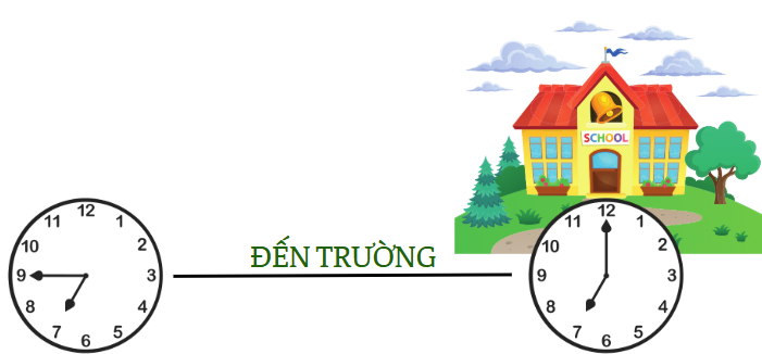 Quan sát đồng hồ rồi cho biết thời gian Mai đi đến trường hết bao nhiêu phút.