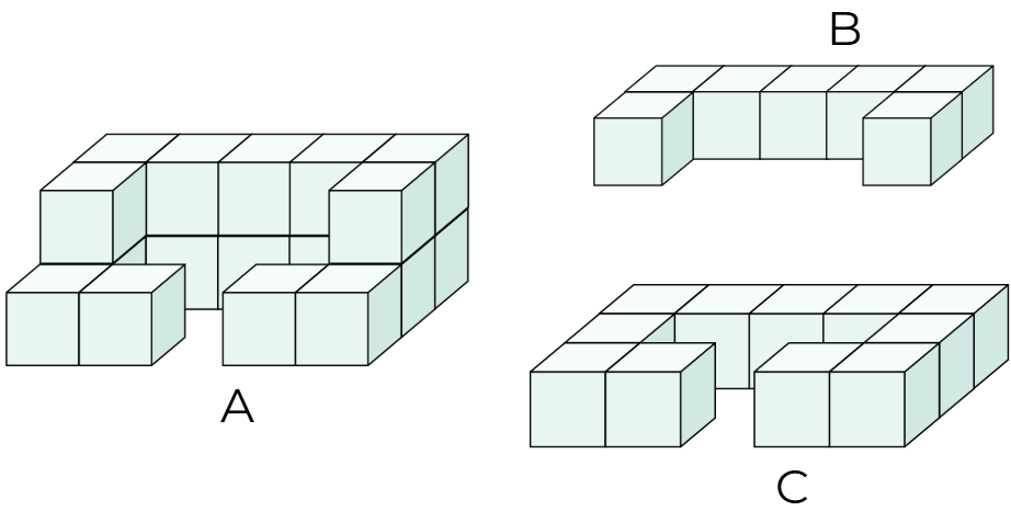Lan tháo rời một hình A được ghép bởi các hình lập phương nhỏ cạnh 1 cm và xếp thành hai hình B và C.