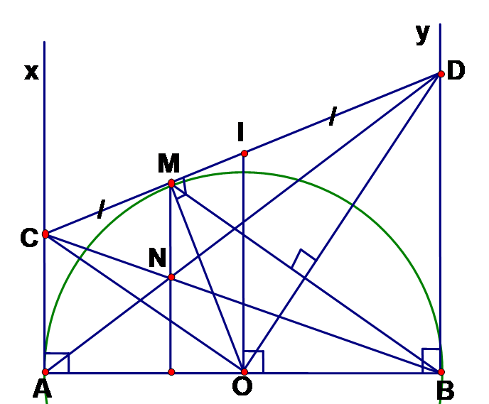 Bài 3. Cho nửa đường tròn đường kính AB = 2R. Từ A và B kẻ hai tiếp tuyến Ax, By. Qua điểm M thuộc nửa đường tròn kẻ tiếp tuyến thứ ba cắt các tiếp tuyến Ax, By lần lượt ở C và D. Các đường thẳng AD và BC cắt nhau tại N.