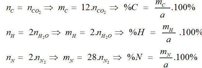 CxHyOzNt (a gam) → mCO2 (g) + mH2O + VN2 (lít)
