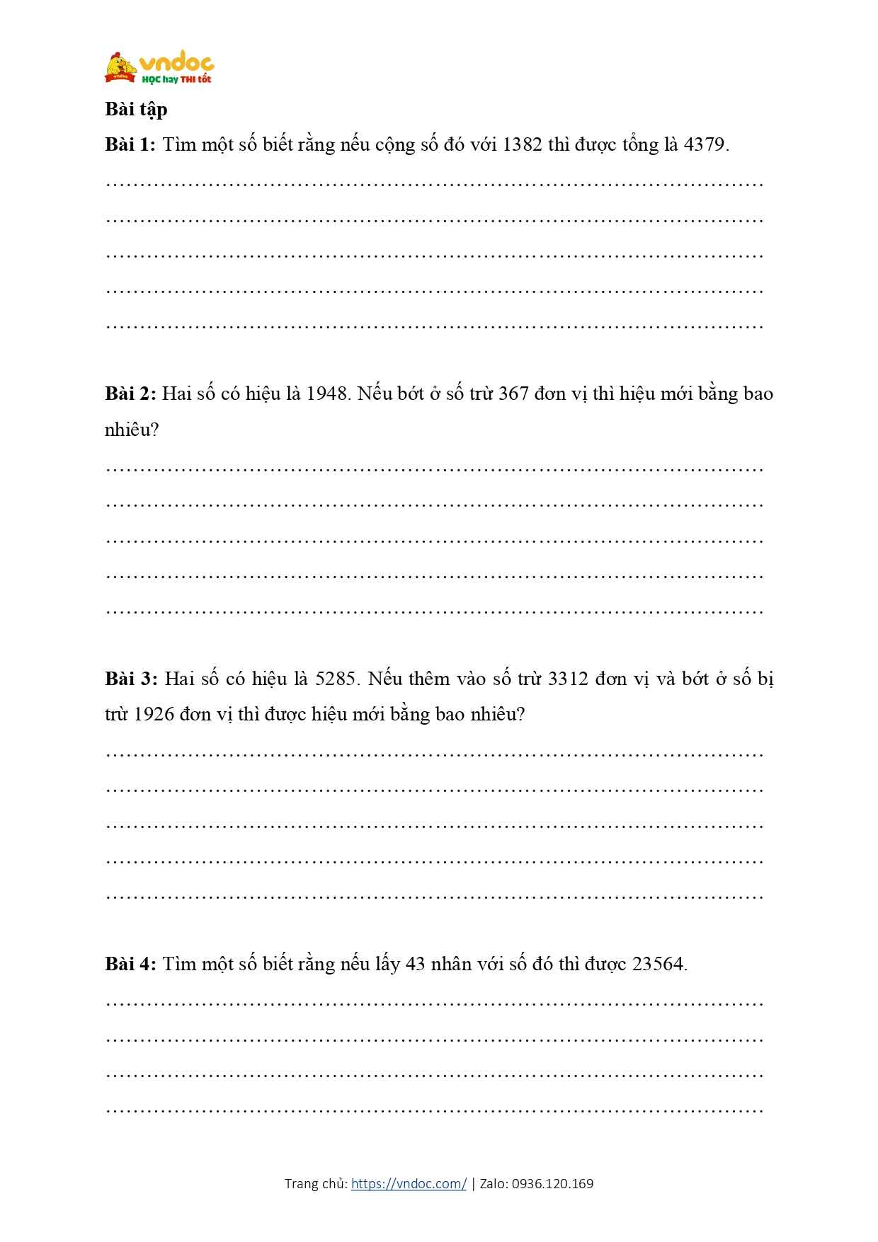 Bài tập Toán lớp 4: Dạng Toán tìm thành phần của phép tính được VnDoc biên soạn, chỉnh lý và tổng hợp giúp các học sinh luyện tập các dạng bài tìm thành phần của phép tính từ cơ bản tới nâng cao. Hi vọng tài liệu này giúp các em học sinh tự củng cố kiến thức, luyện tập và nâng cao cách giải bài tập Toán lớp 4, cũng như giúp các thầy cô có thêm tư liệu ra đề luyện tập cho học sinh. Mời các em cùng các thầy cô tham khảo.