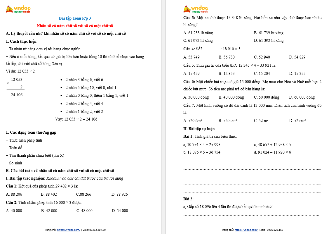 - Nội dung: Lý thuyết và bài tập nằm trong chuyên đề Nhân số có năm chữ số với số có một chữ số (có đáp án chi tiết kèm theo)