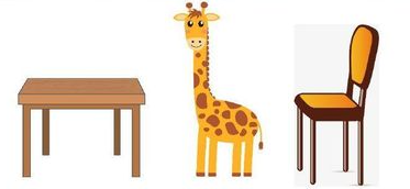Chú hươu cao cổ đứng ở giữa||trên||dưới cái bàn và cái ghế.