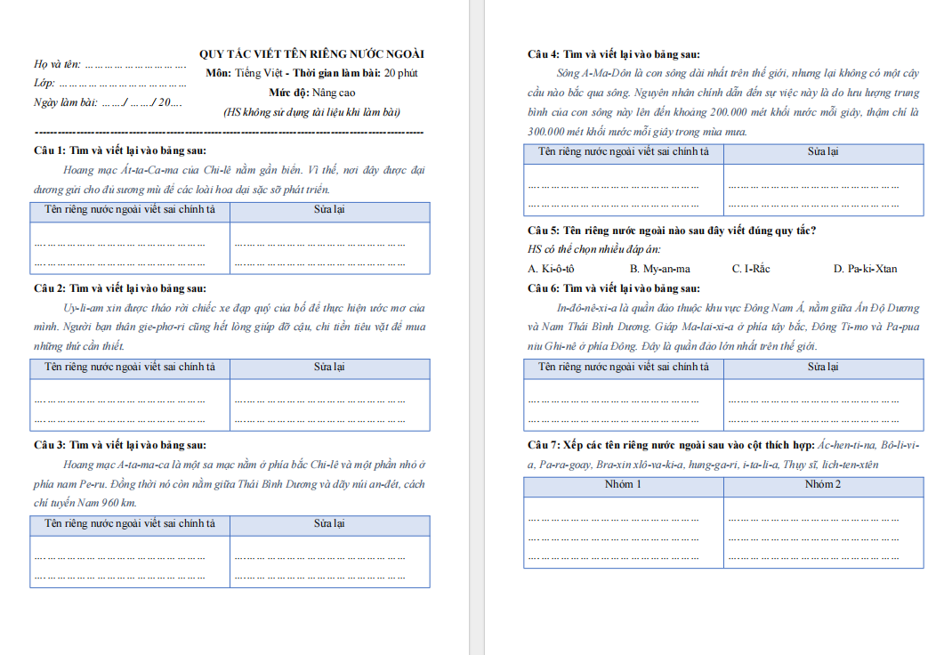 Bài tập về Quy tắc viết tên riêng nước ngoài lớp 5 Có đáp án