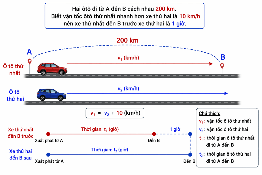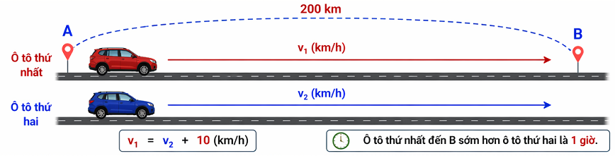 Ví dụ 1. Hai ôtô đi từ A đến B cách nhau 200km. Biết vận tốc ôtô thứ nhất nhanh hơn xe thứ hai là 10km/h nên xe thứ nhất đến B trước xe thứ hai là 1 giờ. Tính vận tốc của mỗi xe.