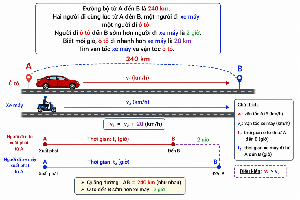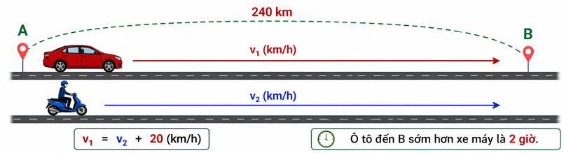 Ví dụ 2. Đường bộ từ A đến B là 240 km. Hai người đi cùng lúc từ A đến B, một người đi xe máy, một người đi ô tô. Người đi ô tô đến B sớm hơn người đi xe máy là 2 giờ. Biết mỗi giờ, ô tô đi nhanh hơn xe máy là 20 km. Tìm vận tốc xe máy và vận tốc ô tô.