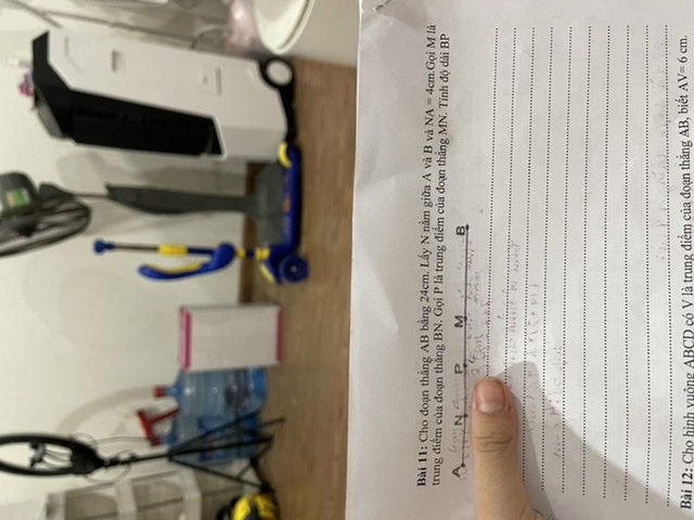 Bài 11: Cho đoạn thẳng AB bằng 24cm. Lấy N Nằm giữa A và B và NA=4cm. Gọi M là trung điêm của đoạn thẳng BN. N là trung điểm của đoạn thẳng MN. Tính độ dài BP