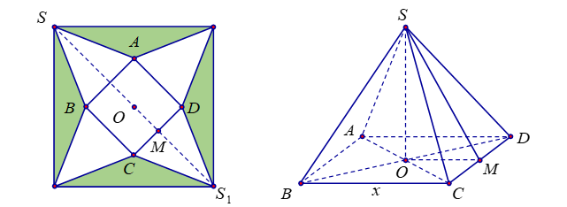 \(x\ (m)\), sao cho bốn đỉnh của hình vuông gập lại thành đỉnh của hình chóp.